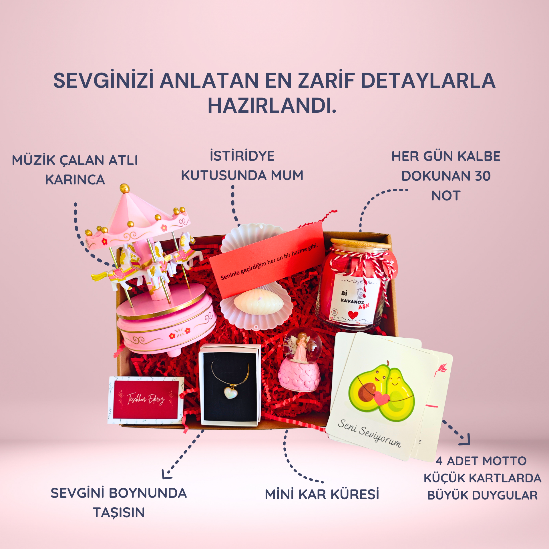 Paket İçeriği: Bi Aşk Kavanoz(30ad. Aşk notu)+Çelik Altın Rengi Kalp Kolye+ Atlı Karınca Müzikli+4 Ad. Motto Kart+ Mini Işıklı Kar Küresi+ İstiridye içinde mum
