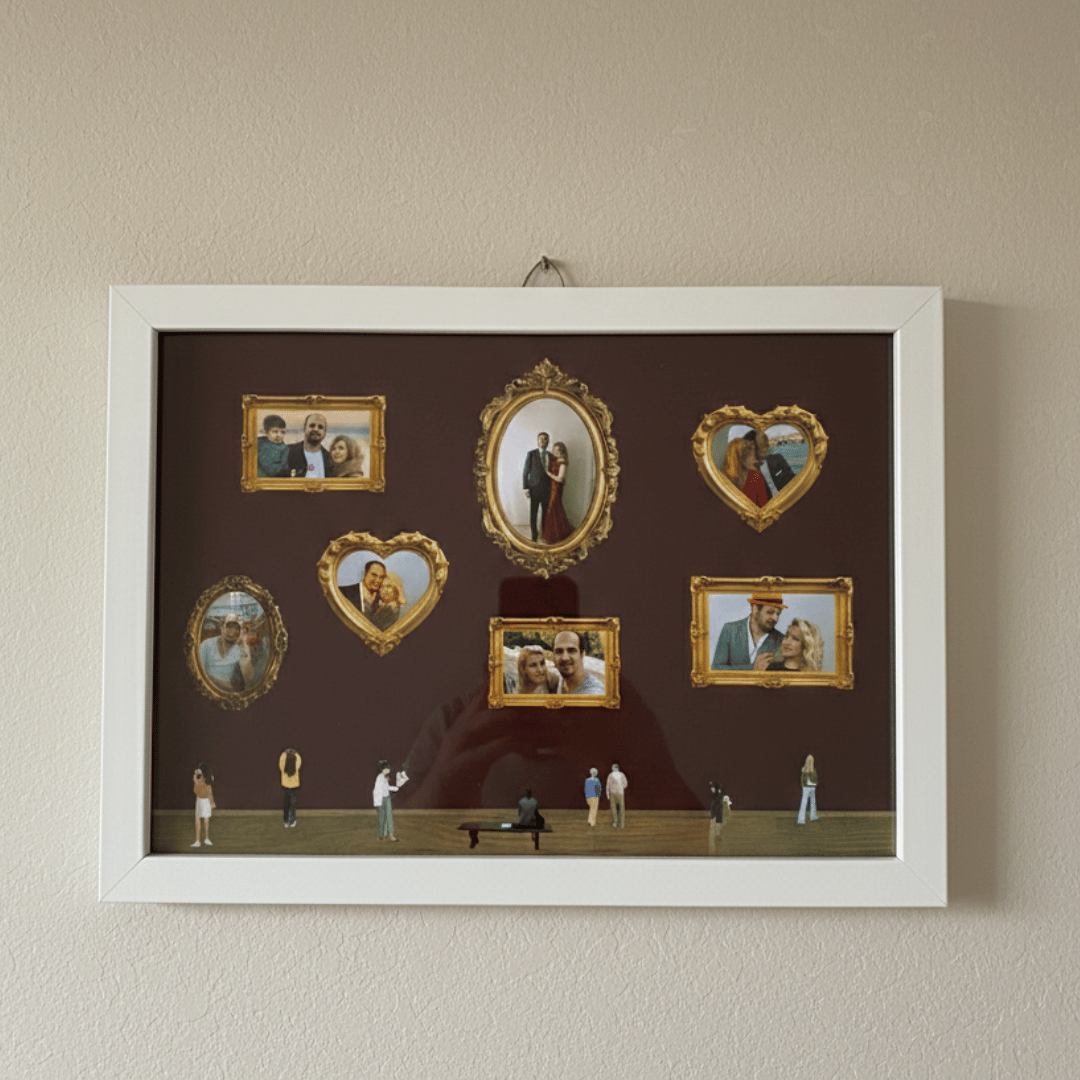 Kişiye özel fotoğraflardan oluşan, müze konseptli, çerçeveli dekoratif tablo. "En Güzel Anılarınızdan Oluşan Size Özel Müze" konsepti.